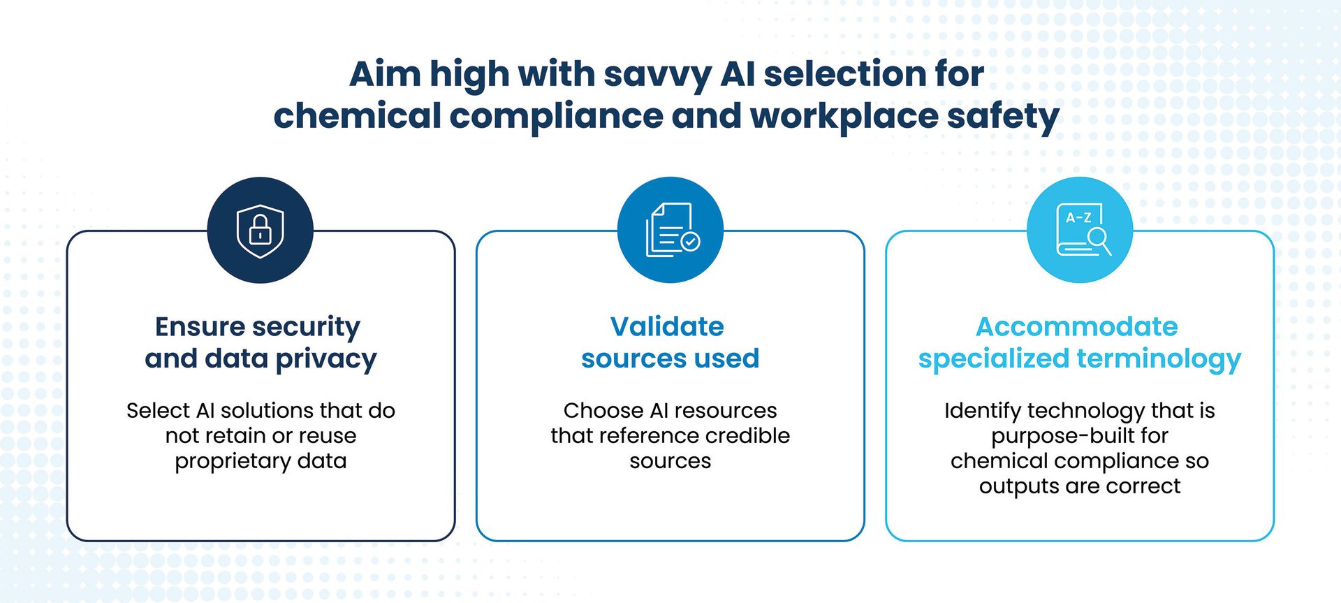 Generalist AI tools may evaluate sources of information that are incomplete or, worse, incorrect. Use AI tools that are trained to reference credible sources. Another thing to remember is that general AI tools often have information cut-offs, meaning that latest information is not included in the evaluation. This is a problem when it comes to chemical compliance and workplace safety.